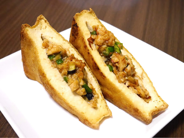厚揚げに切れ目を入れて、先ほど作ったタネを挟んでいきます。たっぷりと溢れるくらい詰め込むのがオススメです。