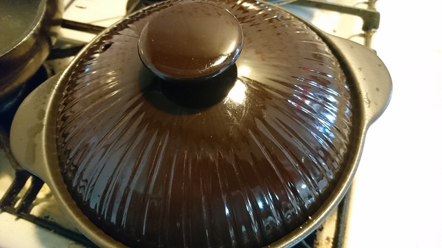 余熱が終わったら、そのままサーマテック土鍋をコンロに移動(IHでもガスでもOK)し、蓋をして弱火で蒸し焼きにしていきます。