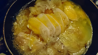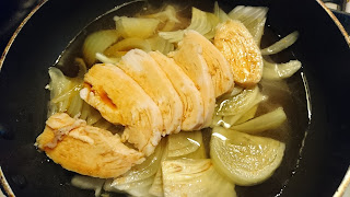 まずは、フライパンに薄切りにした玉ねぎを敷き、その上にカットしたサラダチキンを乗せ、だしの素と醤油を加えて加熱します。