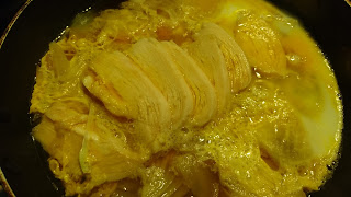 具材に十分に熱が通ったら、溶き卵を入れ、火を弱めます。
