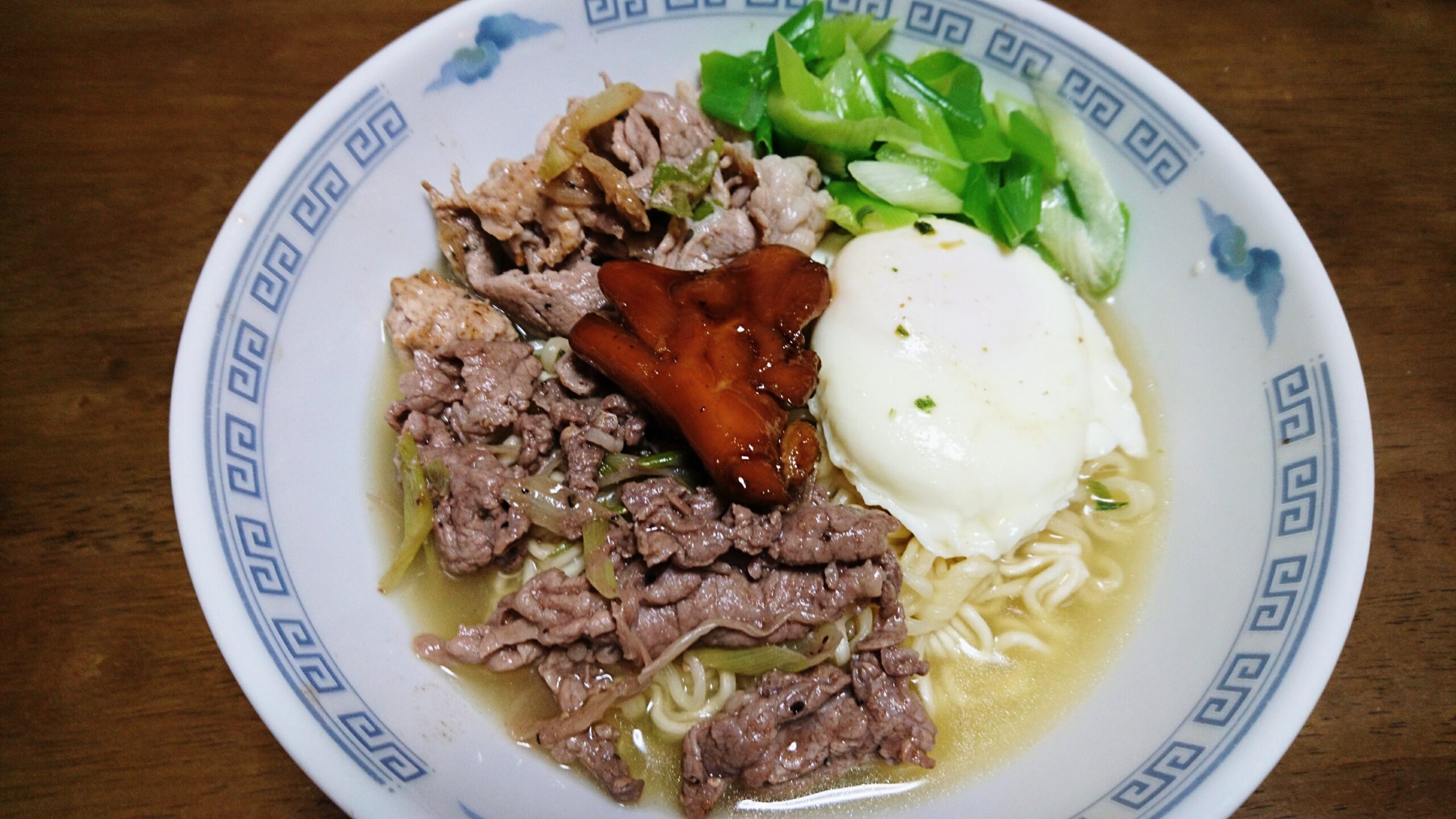 牛肉をたっぷりとトッピングした塩ラーメン(インスタント袋麺)です。