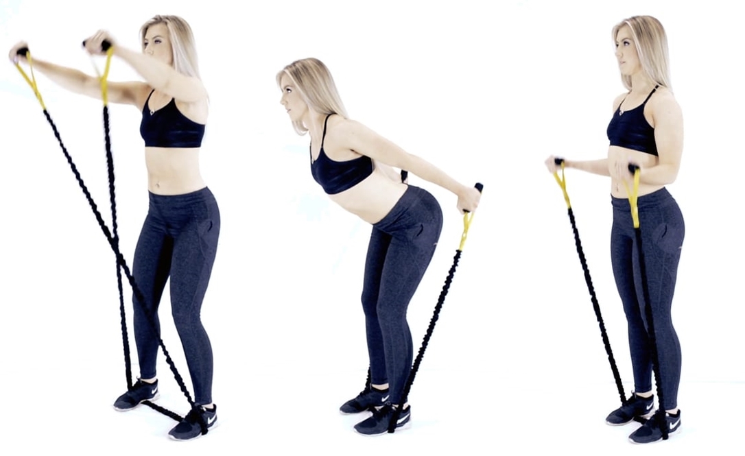 チューブアップライトローイングは初心者でも三角筋を的確に鍛えることのできるチューブトレーニングです。ゆっくりとした動作で上体を反らさずに行ってください。