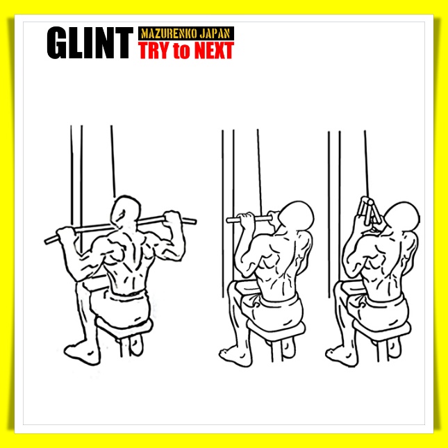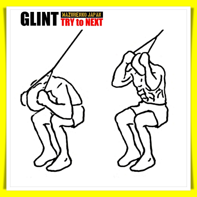 ①ケーブルマシンに座り、アタッチメントを頭の後ろでグリップして構える