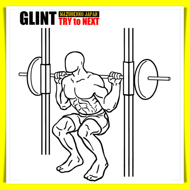 フリーウエイトでのスクワットと違い、軌道が垂直に固定されているため、膝への負担を避けるために、やや足を前においてマシンにもたれる意識で構えてください。