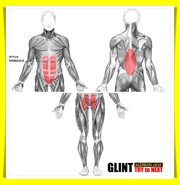 腹筋群は四つの筋肉が折り重なる作りになっており、表面から腹直筋・外腹斜筋・内腹斜筋・腹横筋の順になっています。体幹を曲げたり捻ったりする作用があります。