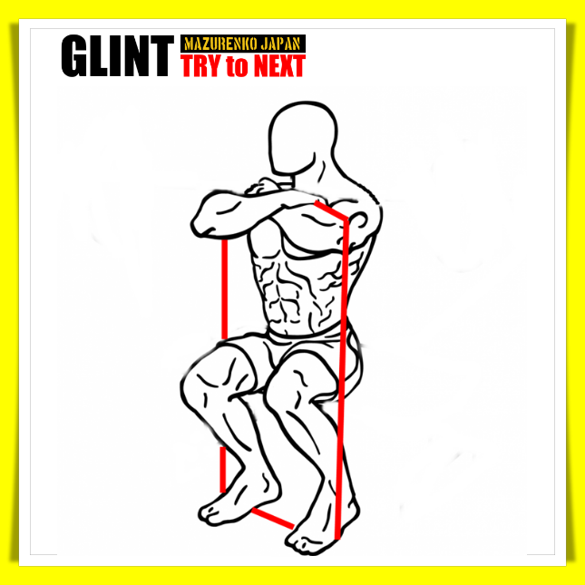 チューブスクワットでもっとも注意する点は、膝をつま先よりも前に出さないということです。膝がつま先より前に出た時点で、負荷は筋力ではなく膝関節の弾性で支えられているだけの状態になり、故障の原因になりますので十分い注意してください。