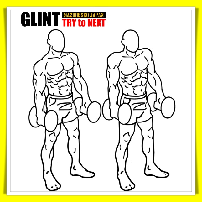 ①背すじを伸ばして立ち、肘を伸ばし腕を下ろした位置でダンベルを持って構える