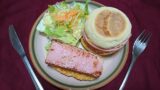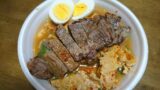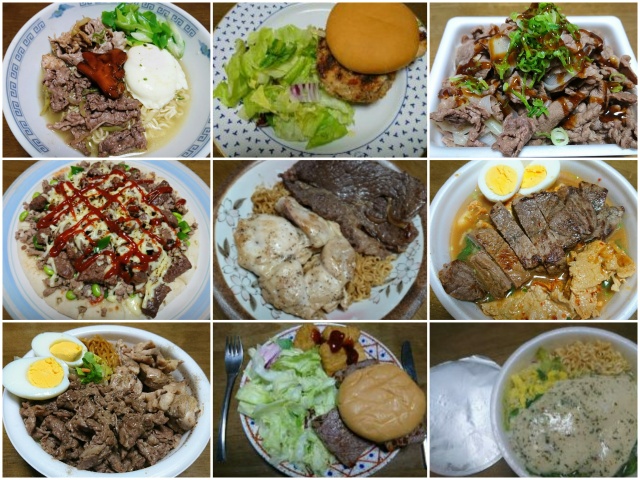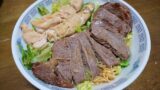 チキンラーメンに牛赤身肉ステーキとササミステーキを追加して栄養素バランスを筋肥大黄金比率にしました。