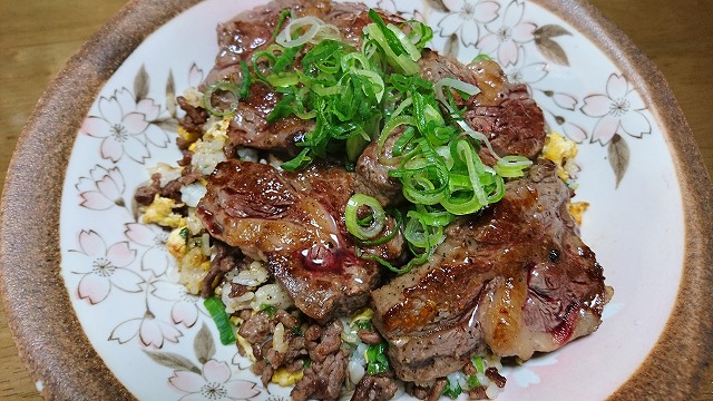 あとは、美味しく焼けたステーキを、牛肉チャーハンの上にトッピングして完成です。