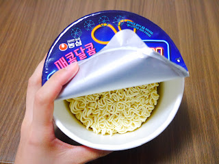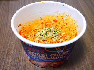 カップの内側の線までお湯を注ぎ、4分待ちます。(作り方の説明欄は全て韓国語で書いてあり全く読めませんでしたが、4という数字があったので恐らく4分置くのだろうと解釈しました。笑)