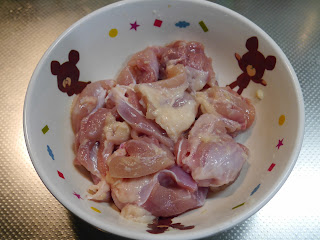 ①まずは鳥のもも肉を一口大に切っていきます。今回はもも肉を使用しましたが、手羽先や手羽元を使っても美味しいですよ。