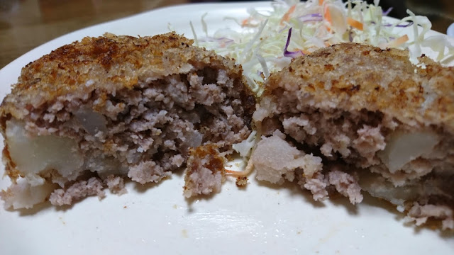 コロッケを割ってみると、じゃがいもよりも肉のほうが遥かに多く、高タンパク質で筋トレに適していることがわかります。