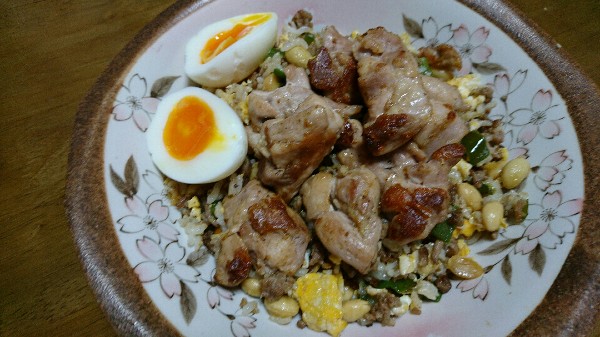 完成しました。ゆで卵もトッピングに追加して、鶏・豚・牛+大豆のカルテットコラボによる高タンパク質高アミノ酸スコアの炒飯が出来上がりました。