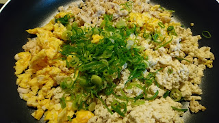 炒り豆腐・炒り卵・鶏むね肉ミンチにネギを加え、塩コショウとオイスターソースで味付けをして、炒めながらまんべんなくかき混ぜていきます。