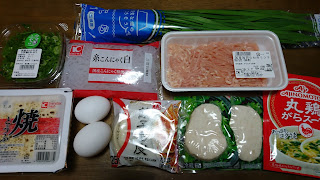 こちらが、今回の材料の鶏むね肉・豆腐・卵・サラダチキン・こんにゃくと野菜・スープ類です。