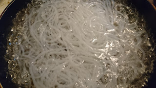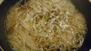 次にラーメンの麺になる糸こんにゃくを煮立てます。こんにゃく臭さをとるために、一度お湯を捨ててから二度茹でするのがポイントです。