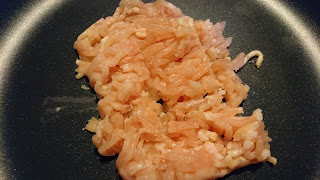 次に、鶏むね肉ミンチを同様に、テフロン加工のフライパンで油を使わずに炒めていきます。