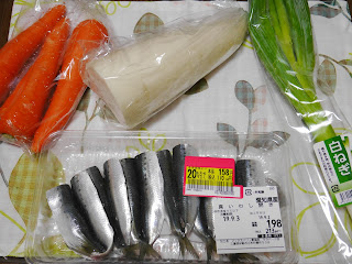 写真は材料の、ウルメイワシ・唐揚げ粉・片栗粉および野菜類です。