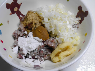 細かくしたイワシに長ネギのみじん切り、味噌、しょうが、和風顆粒だし、片栗粉を混ぜ合わせます。