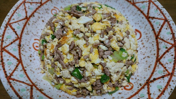 先ほどの豆腐のフライパンに、合挽きミンチと卵を加え炒めていきます。