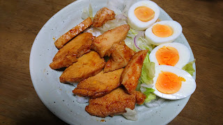 サラダチキンは筋トレのコンビ二食として最適なものの一つですが、飽きがきてしまうのが難点です。そこで、コンビ二のサラダチキンを焼き鳥のタレで焼き、あまりカロリーを上げずになおかつ美味しくいただけるように調理しました。