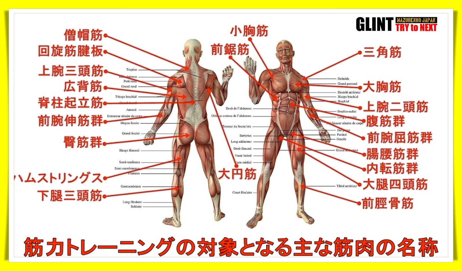 身体を鍛えていく上で、まず理解したいのが全身の主な筋肉の名称と作用です。それぞれの筋肉の役割を知ることで、効率のよいトレーニングを行うことが可能になります。