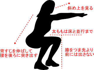 スクワット系種目で全ての基本となるのがノーマルスクワット(自重スクワット)です。そのポイントを図にまとめました。