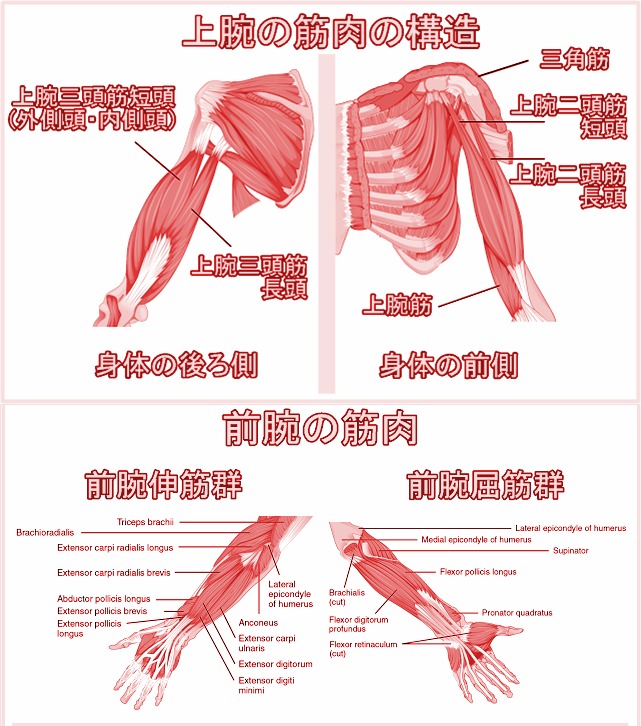 腕を構成する筋肉の名前・構造・作用およびトレーニング方法について解説します。