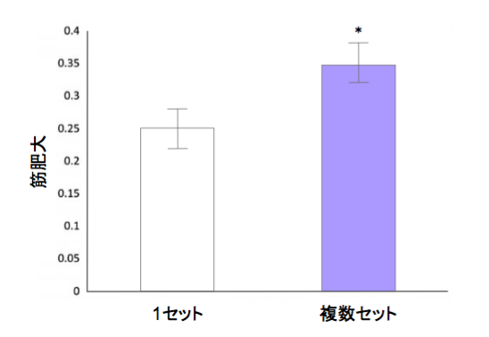 2010年のKriegerらは、1960年から2009年までに報告された研究をもとにメタ解析を行い、1セットより複数セットを行うことによって、有意に筋肥大が生じることを報告しました(Krieger JW, 2010)。