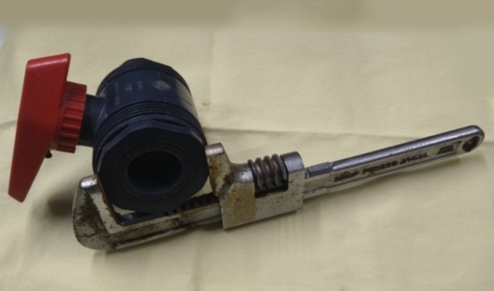 まず、ボディキャップをパイプレンチで挟んで回し、緩めて外します。