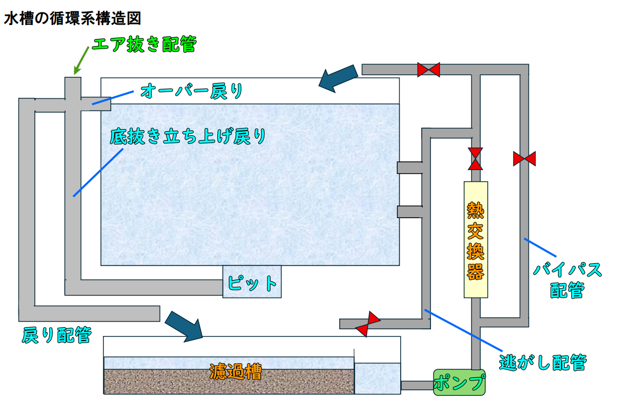 水槽底面のピットから水槽の水を抜き、水面の高さまで配管内で持ち上げてから濾過槽に落とす配管を「底抜き立ち上げ配管」と言います。
