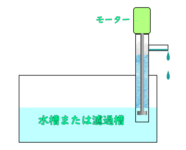 プロテインスキマーは円筒状の本体内部に吸水管と撹拌機構を備えた装置であり、水槽側(または濾過槽)から導入された原水を気液混合域に送り込み、微細な気泡を高密度で生成することで水中の疎水性有機物を効率的に吸着させます。
