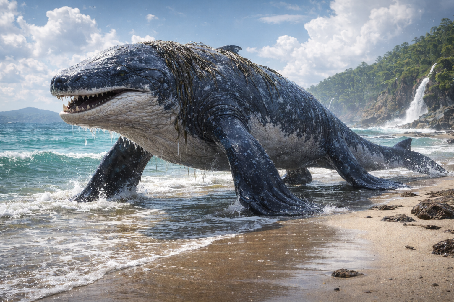生物の大半が死滅した外洋環境を放棄し、浅海域や河口部、水辺環境へと生活圏を移した特殊なクジラ類です。長期的な適応の結果、退化していた後肢の骨格が再発達し、半陸生的な移動能力を獲得しました。