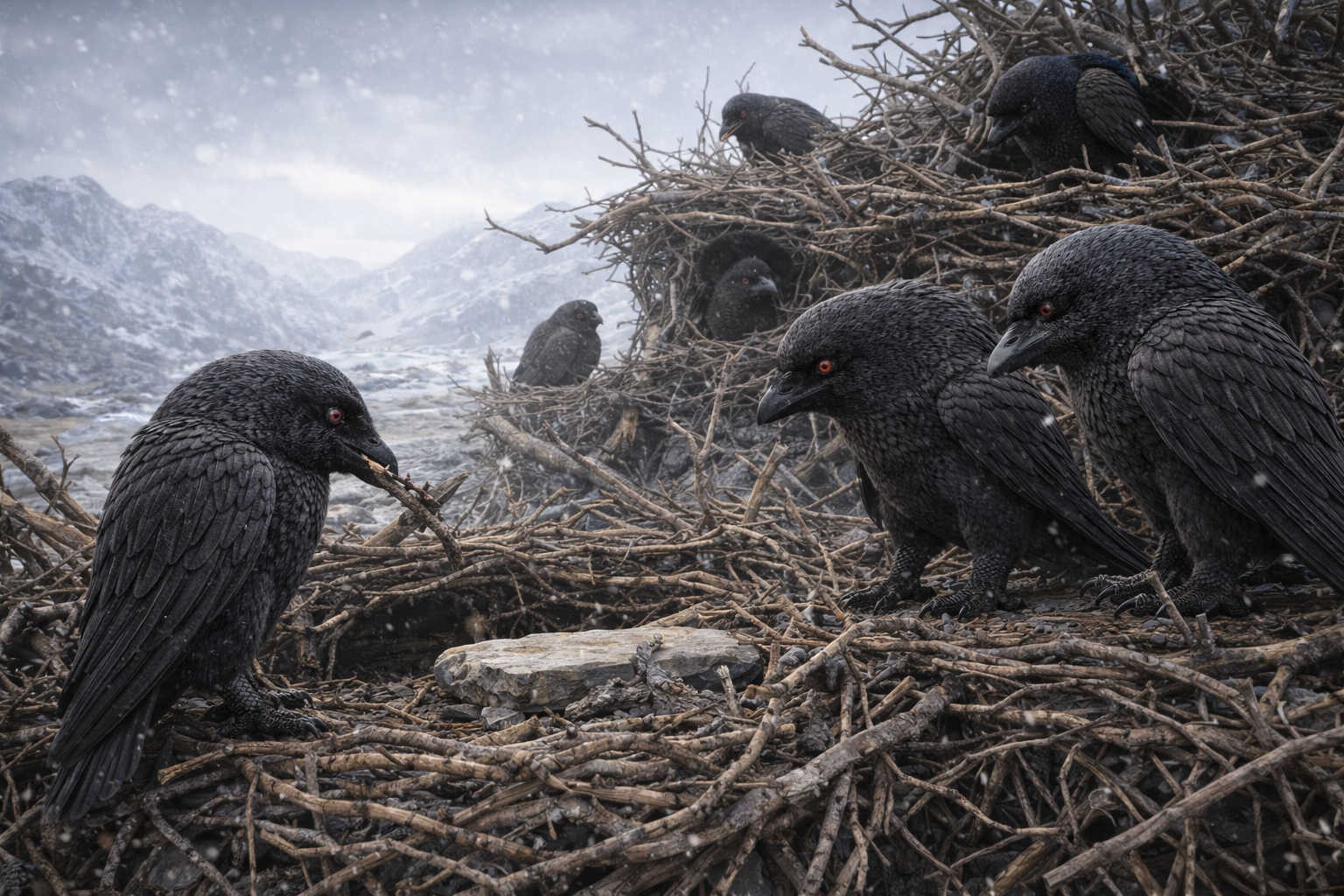 旧人類都市やAI施設跡を拠点とし、金属片や石材を用いた簡易構造物や貯蔵施設を構築していました。嘴と脚を併用した精密作業も行っていたと考えられています。