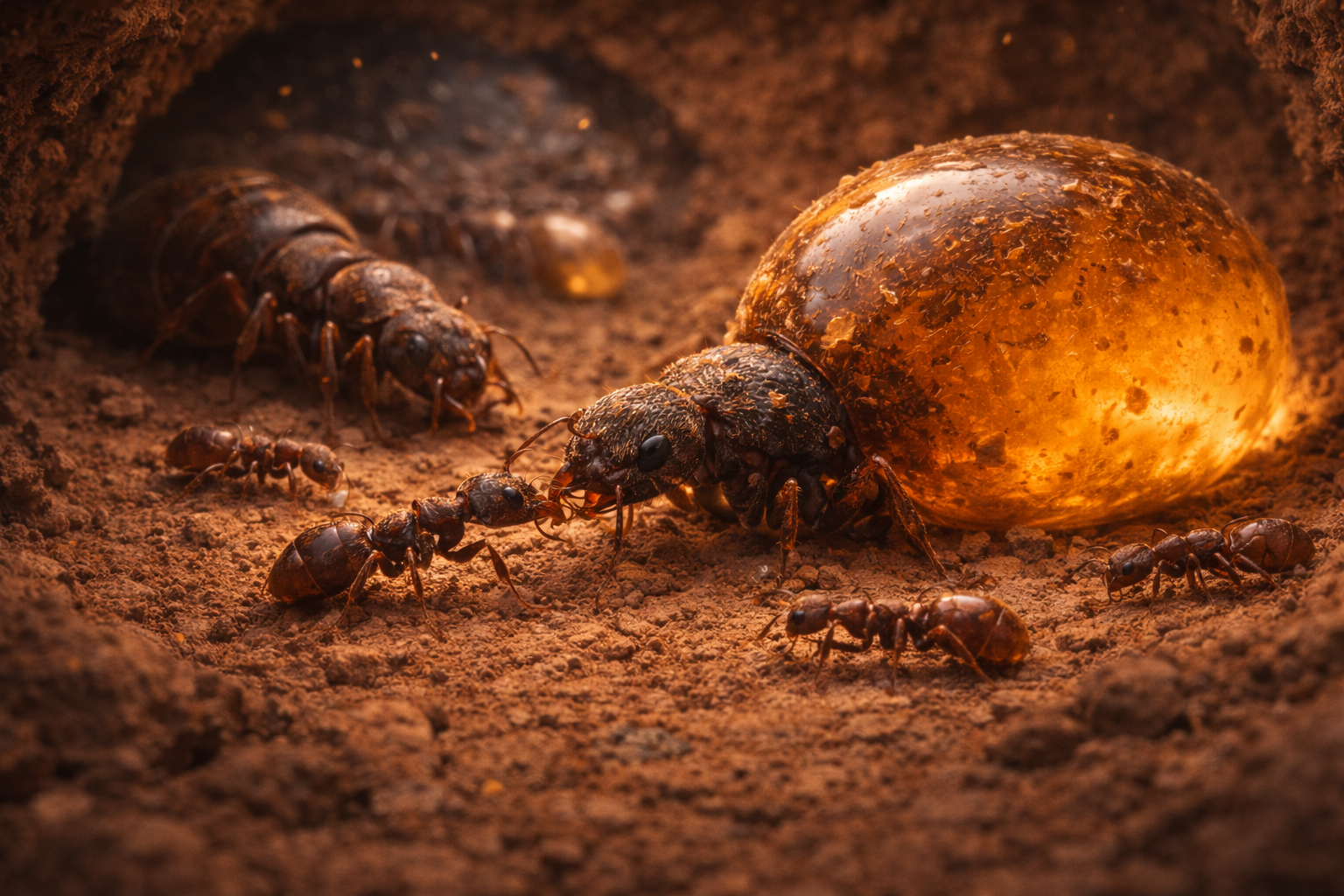 ミズツボアリは、極度に乾燥した来生代前期環境に適応した社会性昆虫です。地下に大規模な巣を形成し、女王・働きアリに加えて、腹部が著しく肥大した貯水個体を持つ点が最大の特徴です。