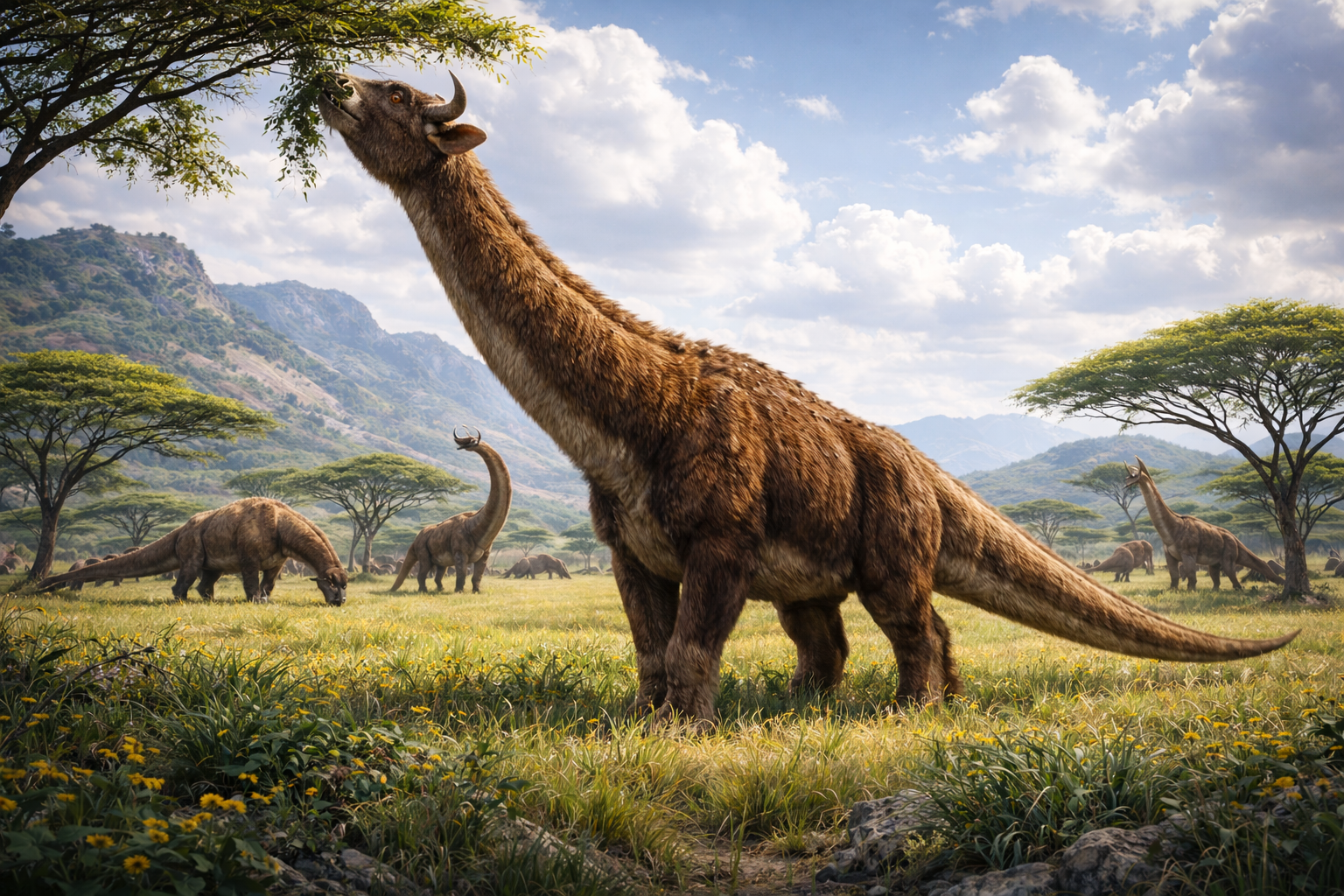 草食恐竜を思わせる長い首と尾を備えた大型草食性ウシ類です。広大な草原環境に適応し、高所の植物資源を効率的に利用できる体構造を発達させました。群れを形成して移動し、次生代後期の草原生態系の基盤を支える存在でした。