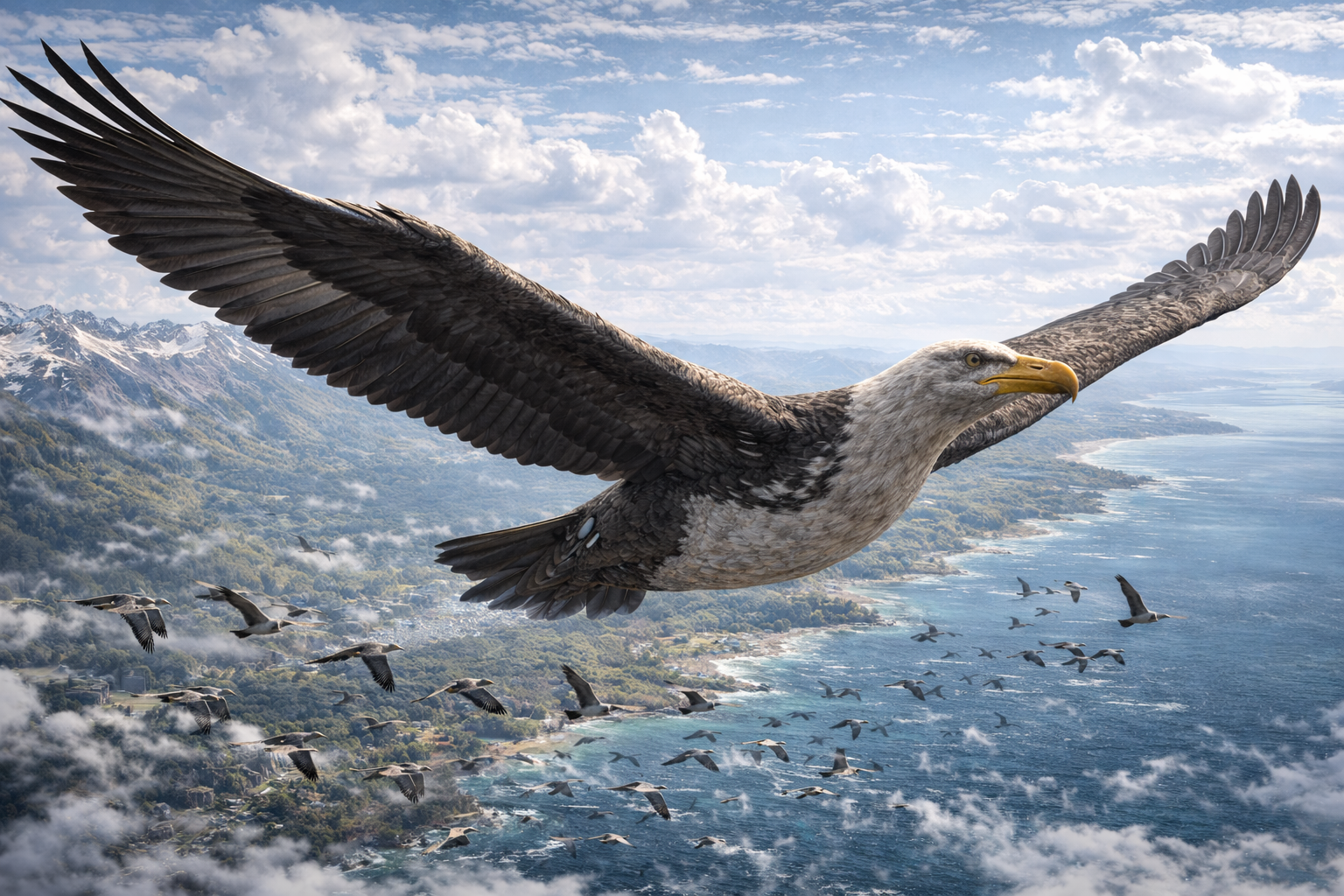 長距離飛行能力に特化した巨大な渡り鳥です。数千キロメートル規模の移動を行い、異なる生態系間の物質循環や種子拡散に重要な役割を果たしました。次生代後期における広域生態ネットワークの中核種とされています。