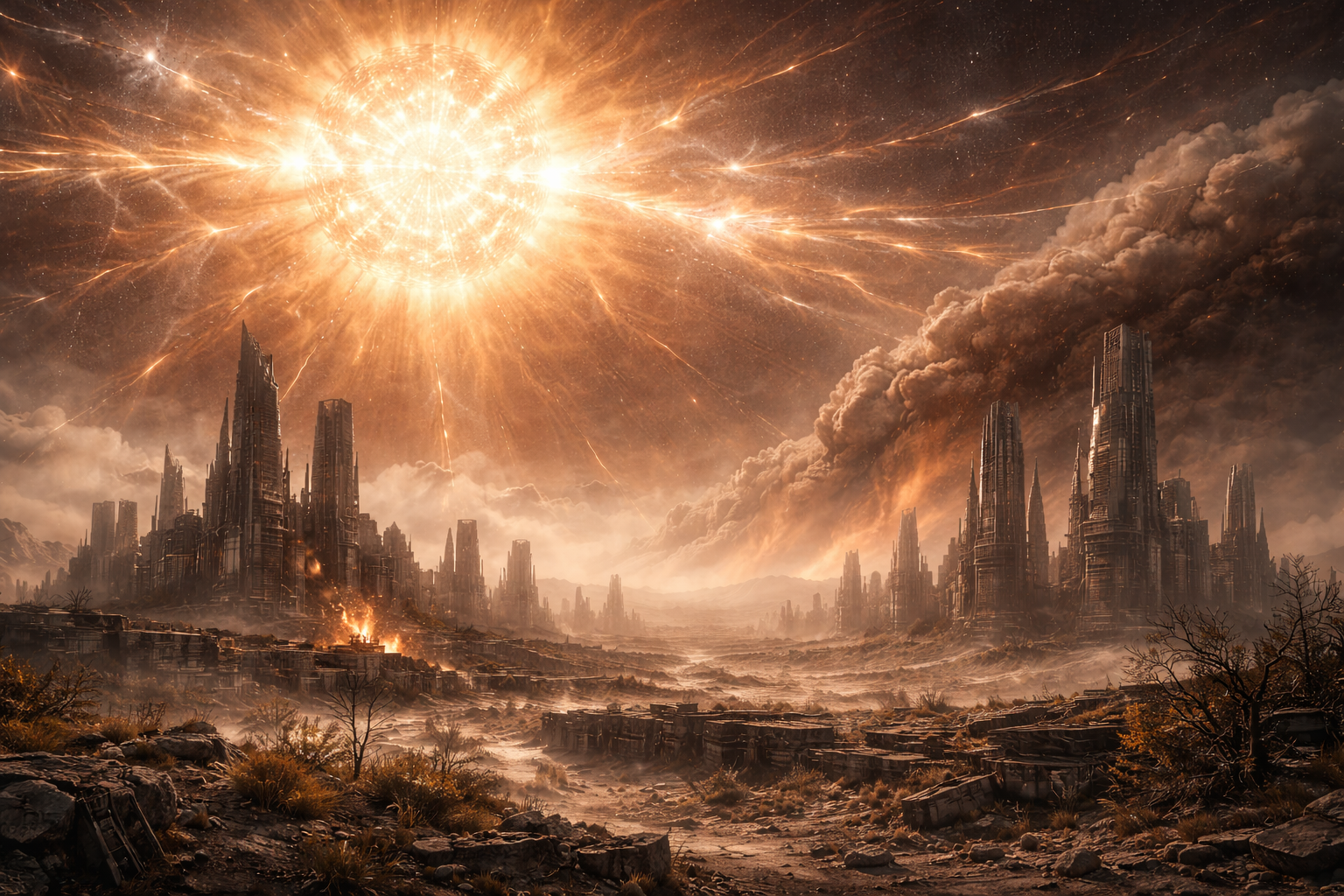 次生代の終焉は、太陽活動の異常活性化によって発生した超巨大フレアと連続的なプラズマ噴出が原因でした。これにより地磁気圏が一時的に破壊され、高エネルギー粒子と強烈な電磁パルスが地表に到達しました。