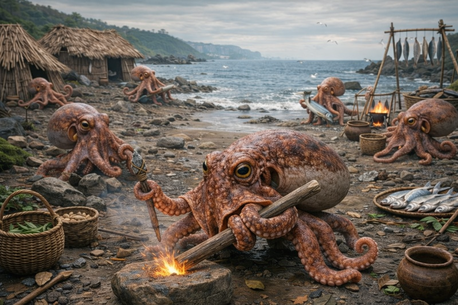 来生代湿潤期に出現した進化型陸上知能タコ類です。肺状外套膜と強化された支持軟骨を獲得し、長時間の陸上活動が可能となりました。