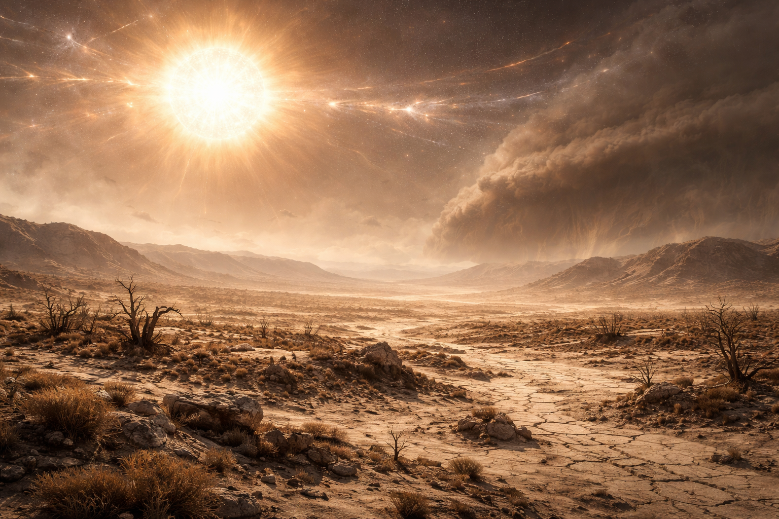 太陽フレアと連続的な宇宙線照射の影響により、地球環境は次生代終末期から急激な変化を迎えました。成層圏オゾン層の大規模破壊と大気組成の攪乱により、地表には強烈な紫外線と放射線が降り注ぐようになり、同時に全球規模の気候変動が発生します。