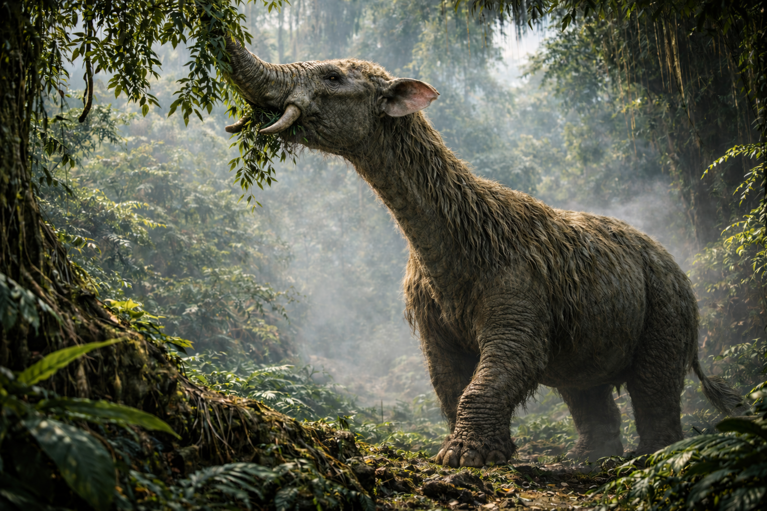 湿潤化した熱帯〜亜熱帯森林に適応した超大型草食哺乳類で、発達した鼻と長く進化した首を用いて高木植物を摂食していました。森林生態系の構造維持に重要な役割を担っていました。