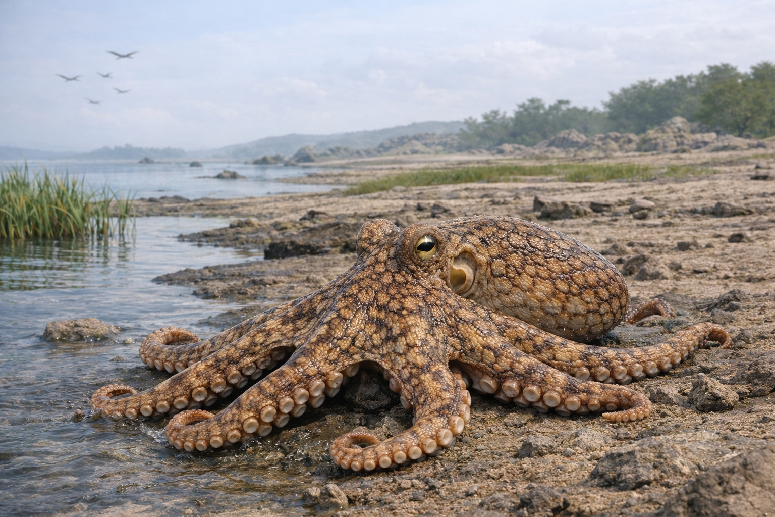 ミズベダコ(Amphioctopus limnophilus)は、来生代前期から中期にかけて出現した半両生型タコ類です。高温乾燥化によりニッチが空白化した、河口域・汽水湖・湿地帯を主な生息域として進化しました。