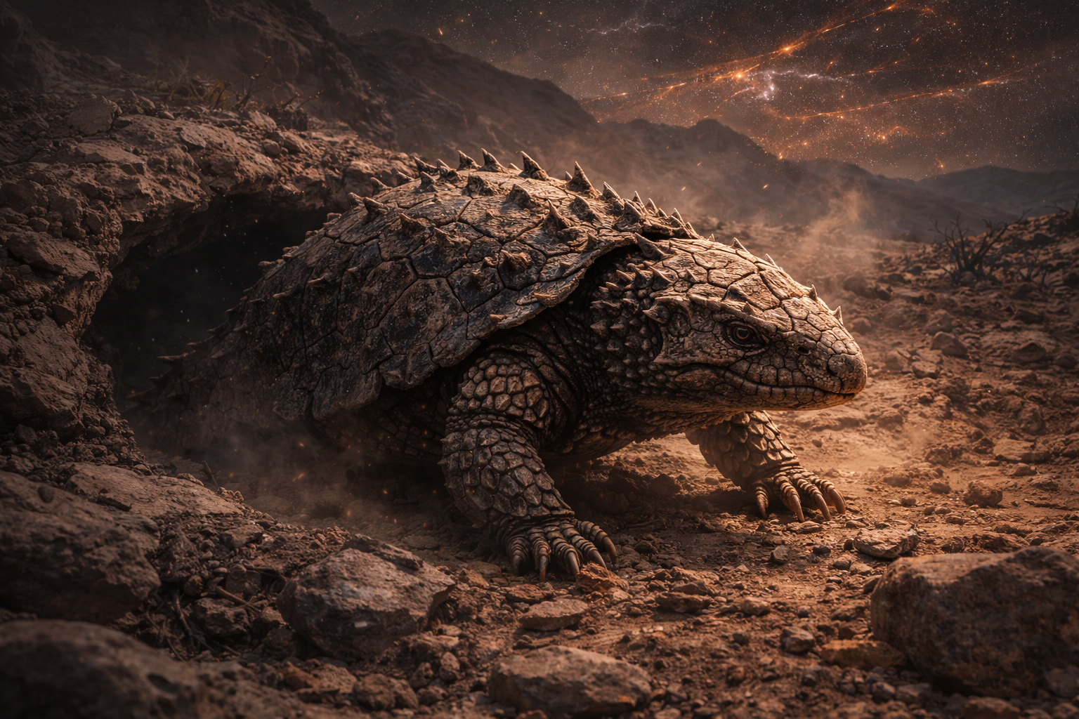 厚い角質鱗と骨質装甲を備えた地下性爬虫類です。昼間は地下深くに潜み、夜間のみ地表に出て活動しました。高放射線環境下でもDNA損傷を自己修復できる特殊な細胞機構を持っていました。
