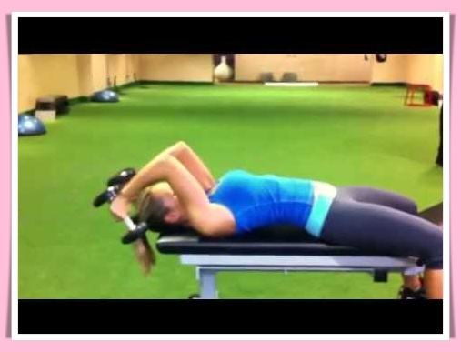 ①ベンチに仰向けになり、肘の位置を固定してダンベルを両手を保持して頭上に構える
