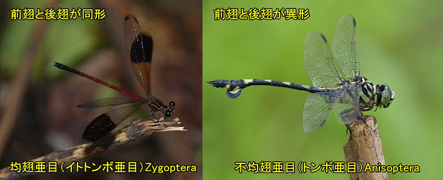 トンボは大きくは2つの仲間に分けられます。それは、均翅亜目(イトトンボ亜目)Zygopteraと不均翅亜目(トンボ亜目)Anisopteraで、前者は前翅と後翅が相似形であるのに対し、後者は前翅と後翅が異なります。