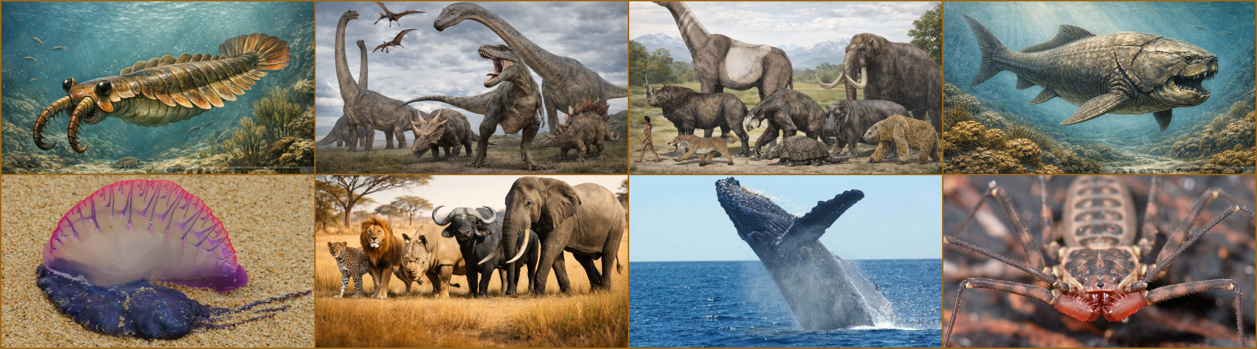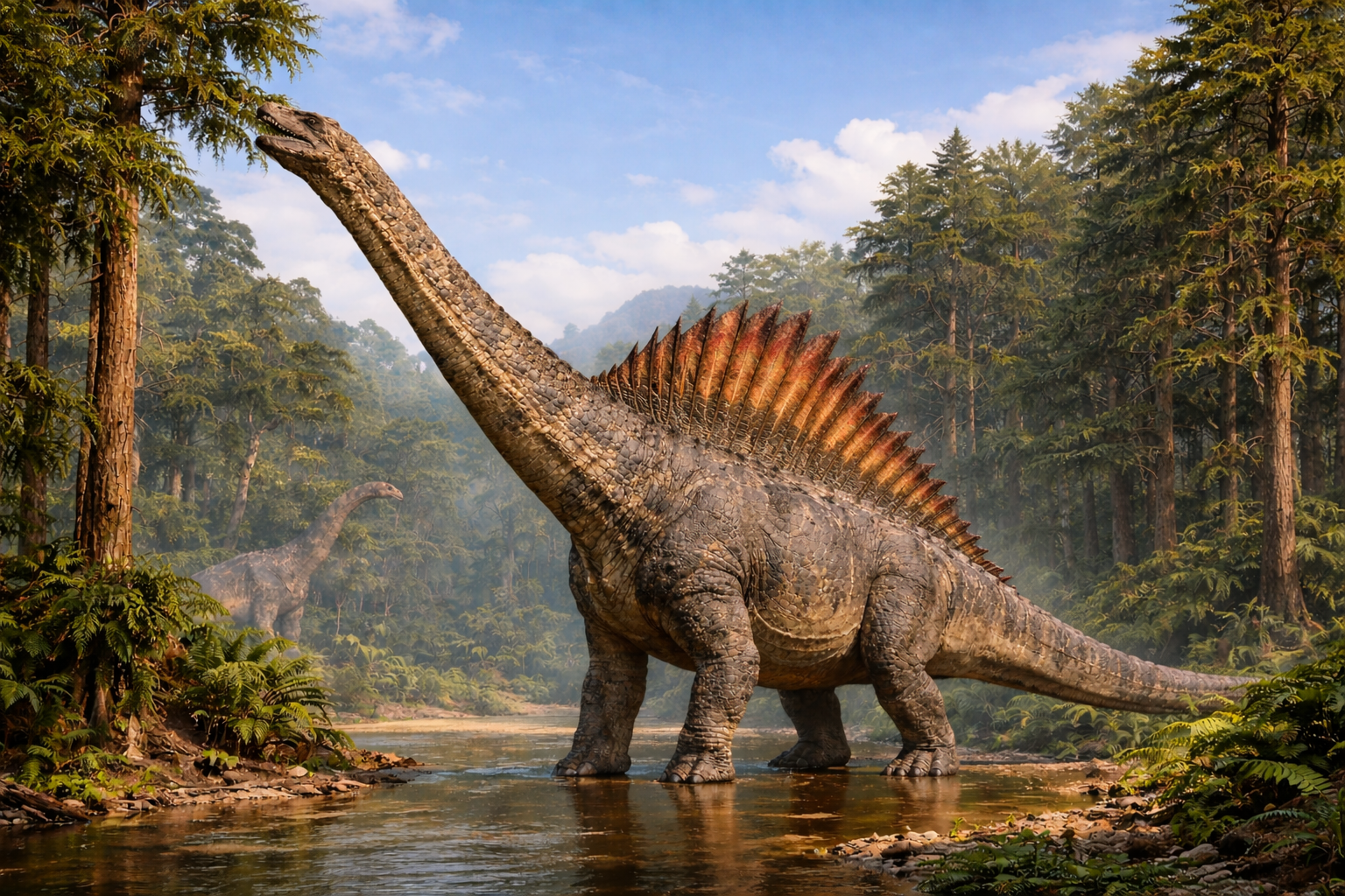 高温多湿な気候と豊富な植物資源に支えられ、恐竜の巨大化が極限まで進んだ時代です。森林の高層化と捕食競争の激化により、体格の拡大が最も有効な生存戦略となり、生態系は巨大生物中心に構成されていました。