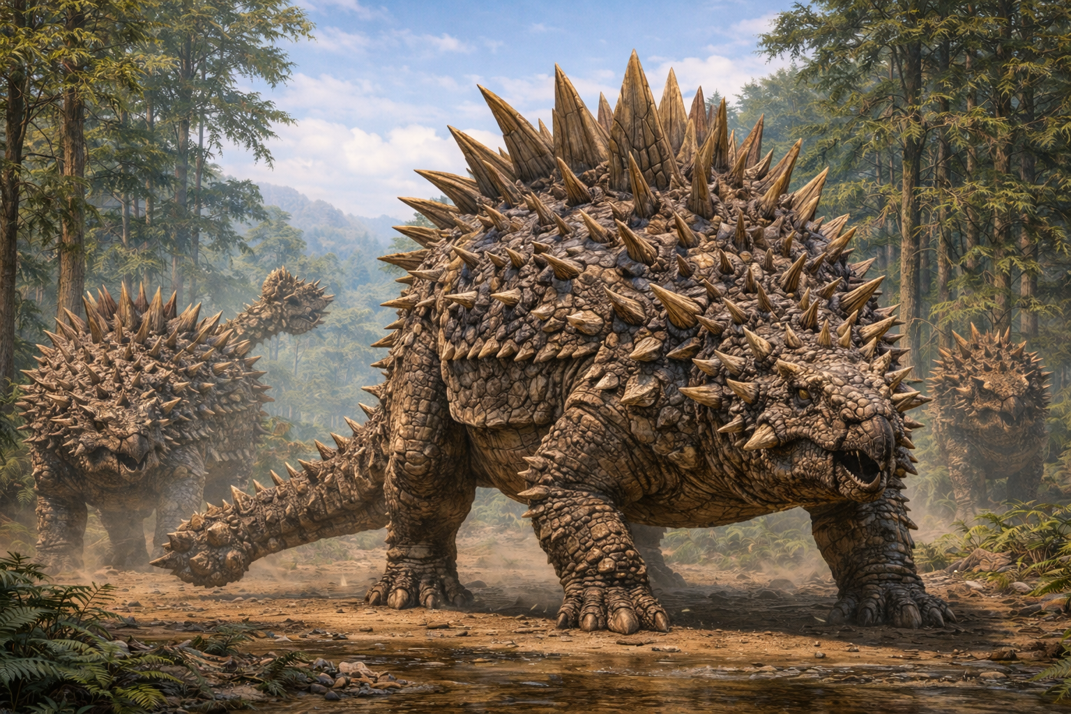 全身を覆う骨板と強力な武器尾部を備え、群れで行動することで捕食者への対抗力を高めていました。