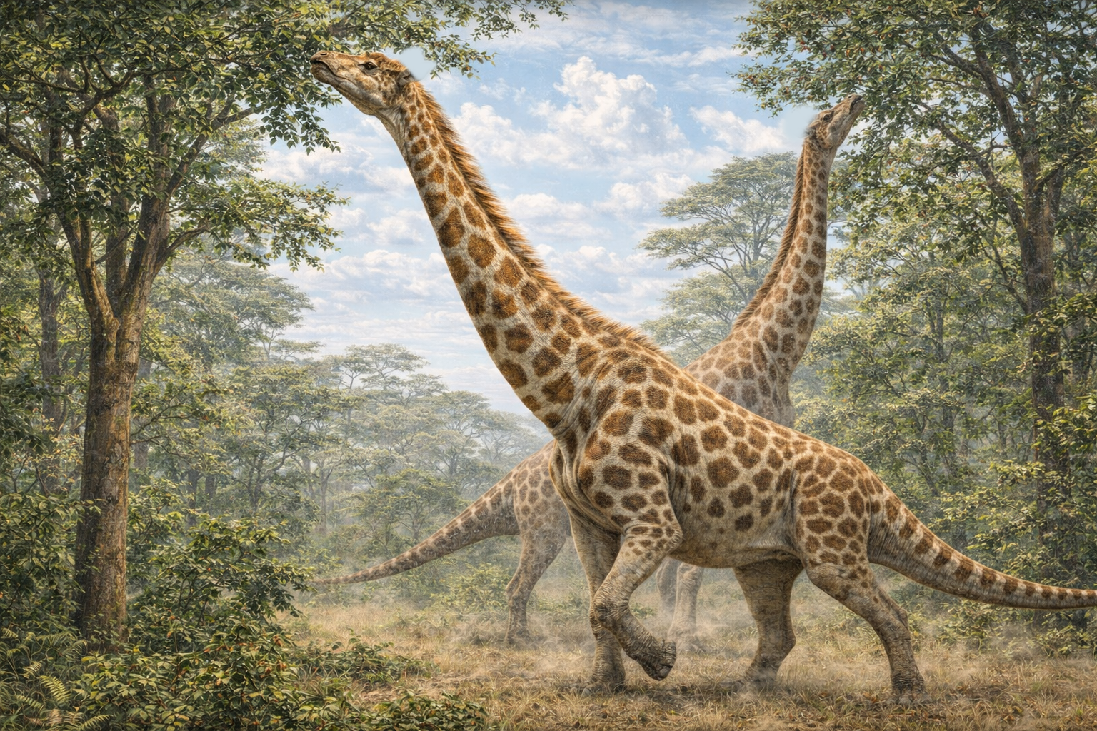 Giraffasaurus excelsusは、首と前肢が極端に伸長したキリン型竜脚恐竜です。前脚が後脚より長く、体を斜めに支える姿勢で高木の葉を専門的に採食します。心肺機能と血圧調整能力が高度に発達し、超高位置でも安定した摂食が可能です。森林上層部を独占することで競争を避け、生態系の立体分化を促す役割を担っています。