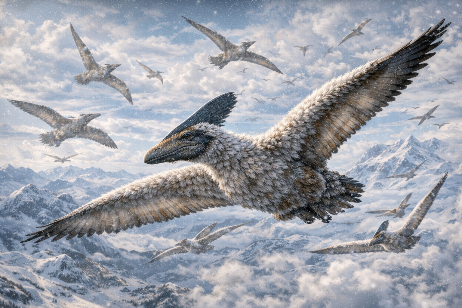 季節移動を行う飛翔恐竜で、寒冷期には温暖地域へ移動する高度な回遊行動を示していました。全身に羽毛を獲得しています。