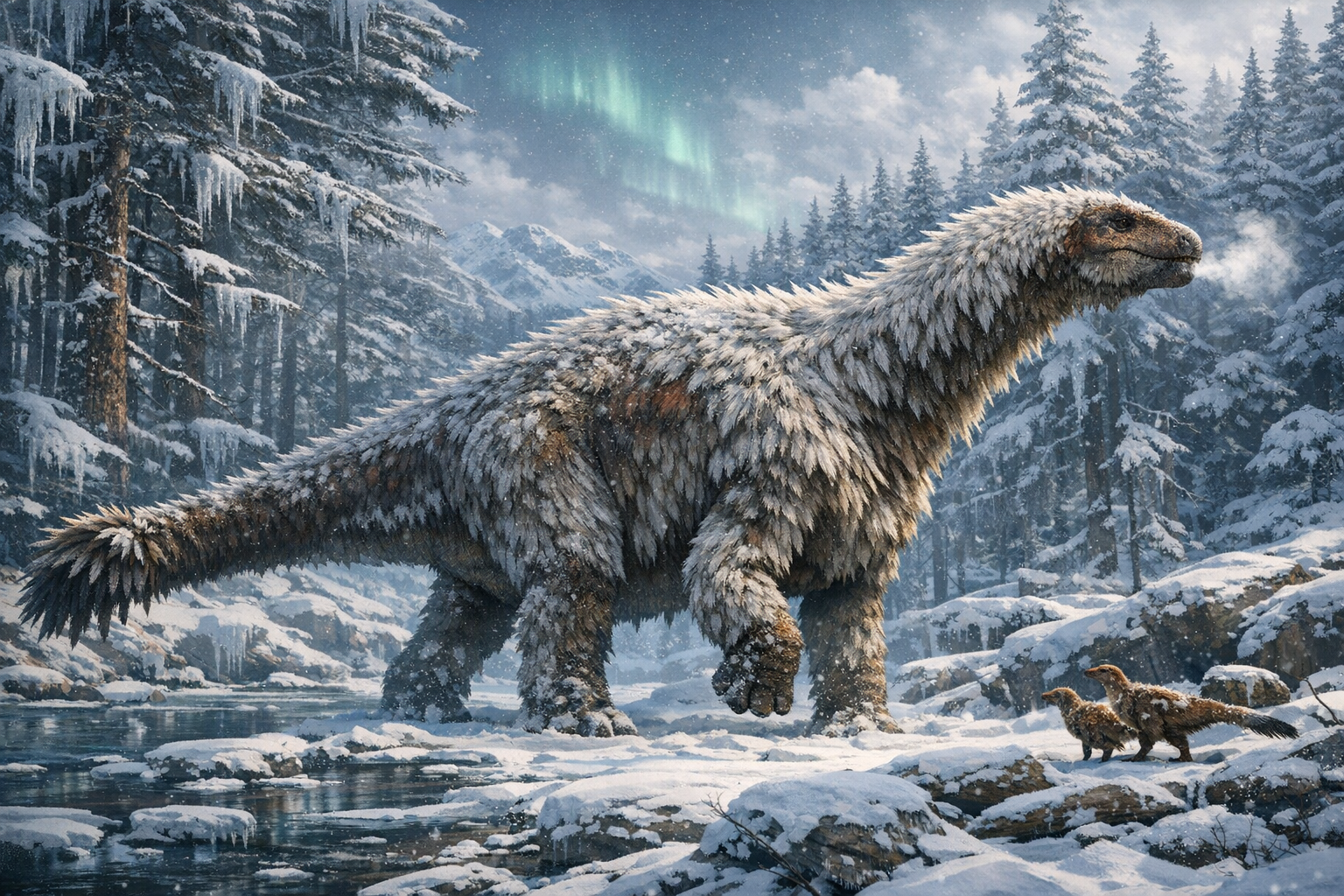 厚い羽毛層で体温を保持し、積雪地帯でも群れ生活を維持できた耐寒型角竜類です。